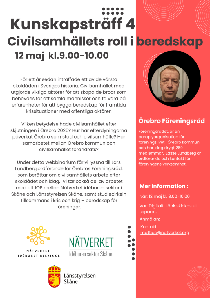 Föreläsningen knyter an till Nätverkets arbete med samverkan, överenskommelsen i Blekinge och den idéburna sektorns roll i att möta samtidens samhällsutmaningar.